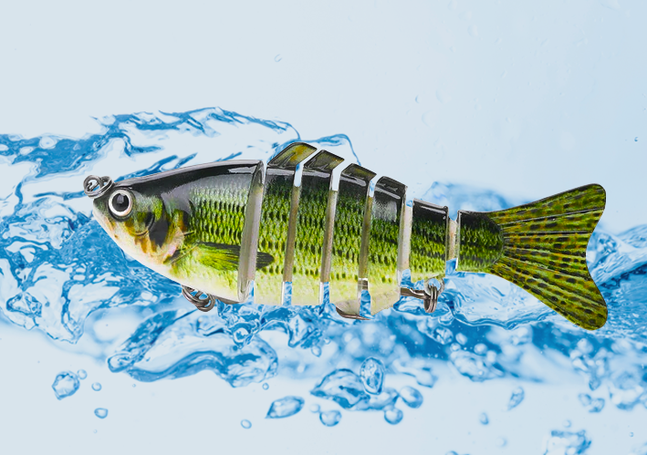 • The body of the swimbait is joined in sections with textile fabrics that allow it to wiggle from side to side. This intentional joint design adds more flexibility in the swimbait’s movements. When it's in the water and you're reeling it in, it actually looks like a small fish is swimming towards you!